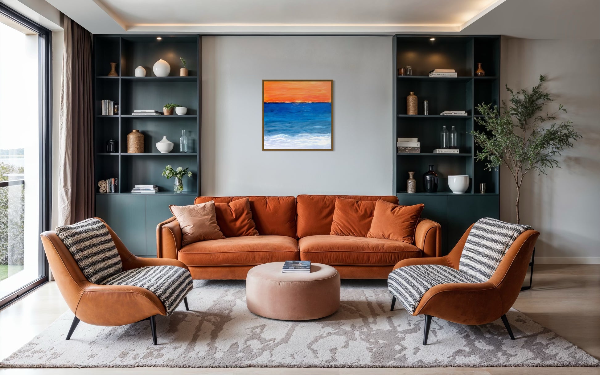 Dusk Line blends fiery oranges with deep blues in a calming, balanced composition.